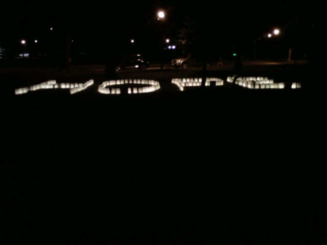 “And if everyone lit just one little candle . . .” A photo from a recent cancer walk in Canada. A luminary for each family member or friend who had died from cancer, one of our Sister’s mother was represented. She aptly described this photo: “Hope in the midst of darkness.” Her niece, a brave young cancer survivor, walked.